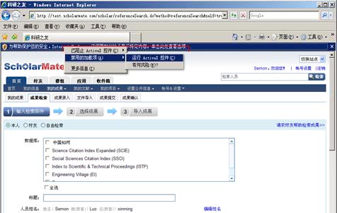 (2) IE安全级别。请在设置IE浏览器的安全级别:在 “工具->Internet选项->安全->自定义级别”查看“对标记为可安全执行脚本的ActiveX控件执行脚本”的选项,请选中“启用”选项。同时确保将“下载已签名的控件”设“启用”。(提示:跨文献库检索工具经过严格测试和并经过专业认证机构的签名,不会对你的系统造成影响。)